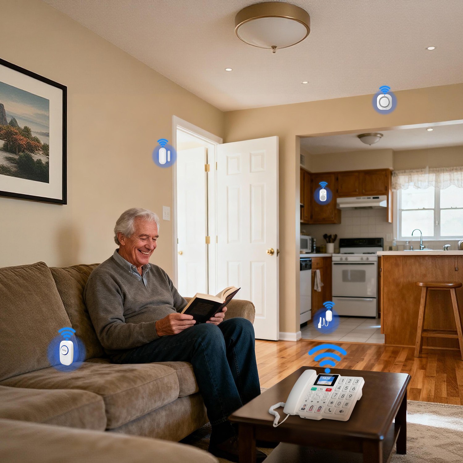 Various sensors connect to the phone via the 433 MHz frequency band, and the phone is connected to the cloud platform. Emergency phone numbers or message notifications are preset on the platform. When a sensor is triggered, the platform will place calls to the designated contacts or institutions.