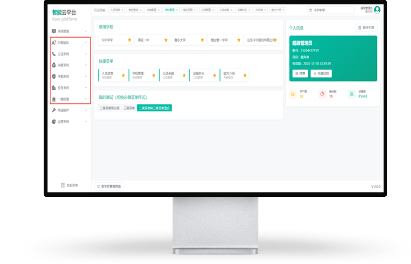 The Kaer Smart Cloud Platform establishes a school-level intelligent management hub through cloud deployment, deeply integrating multi-dimensional control functions such as personnel management, device management, area management, and permission management. This achieves centralized operation and maintenance with "one platform managing the entire school." The platform supports full lifecycle management of smart student ID devices, including batch registration and deactivation, and centrally configures geo-fencing strategies such as electronic fences and restricted zone alerts (area management). It also standardizes administrative procedures through a hierarchical permission system (permission management). Additionally, it provides SOS emergency call links and whitelist communication rule configuration, complemented by unique modules like classroom stealth mode (other management functions). This enables administrators to synchronize strategies and coordinate personnel information for over 2000 terminal devices via a single platform, improving management efficiency by more than 80%.